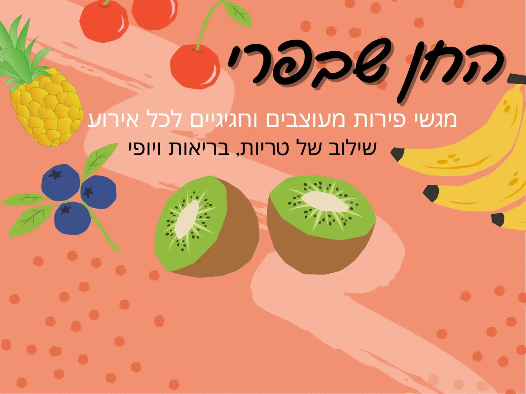החן שבפרי מתמחה בהכנת מגשי פירות מעוצבים, מרהיבים וחגיגיים לכל מטרה – ימי הולדת, חגים, אירועים משפחתיים, מתנות ועוד. כל מגש מורכב מפירות מובחרים, טריים ואסתטיים, ונערך בצורה מוקפדת שמביאה לידי ביטוי את האהבה ליופי ולאירוח. העסק ממוקם בקדימה ופועל בעיקר באזור השרון, כולל שירות משלוחים ליישובים בסביבה (בתוספת תשלום). ניתן לשדרג את המגשים ממגשי פלסטיק למגשי עץ או זכוכית. התמונות באתר הן להמחשה בלבד – הרכב הפירות עשוי להשתנות בהתאם לעונה.
